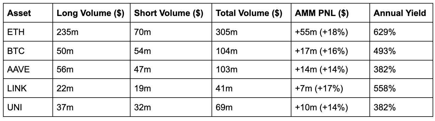 The below table shows the total long options volume (dollars of premium paid by traders), short options volume (dollars of premium collected by traders), total volume and PNL of the AMM, with the return percentages calculated with respect to the volume traded.