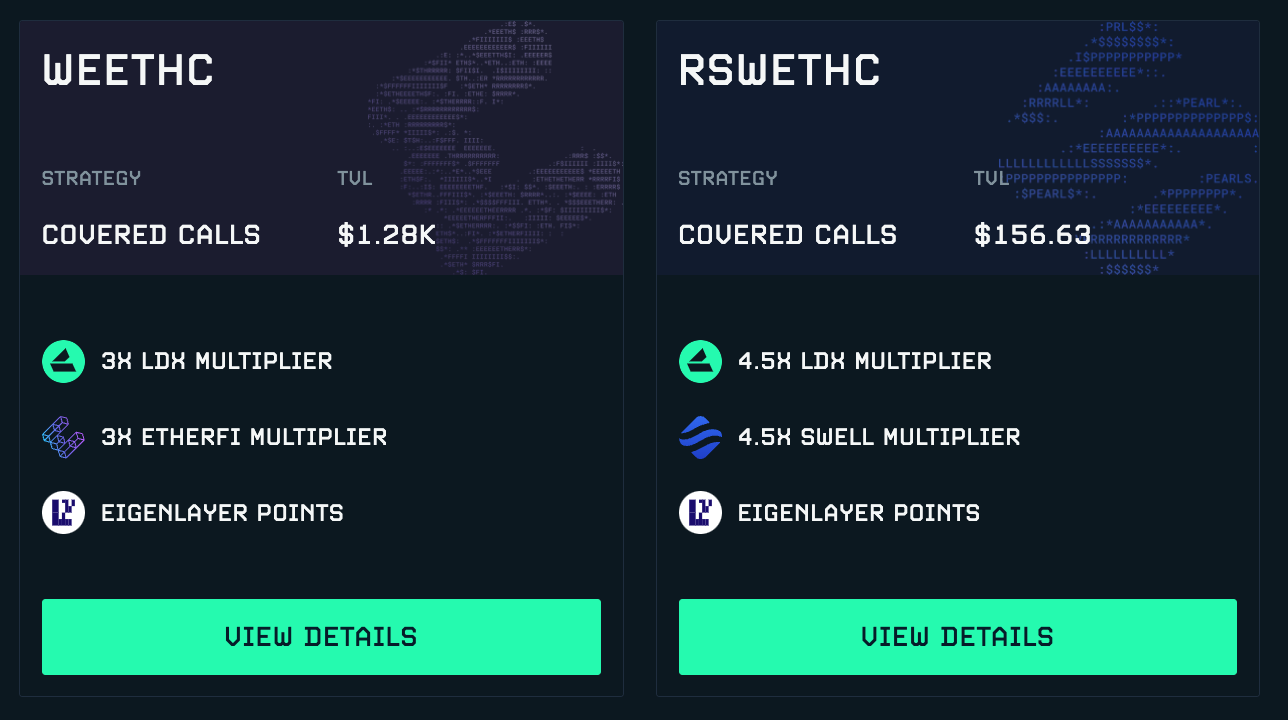Today, Derive, is pleased to announce the launch of a new covered call strategy using rswETH from Swell and weETH from EtherFi as collateral. This program offers ETH holders a sustainable way to generate additional income through an automated, tokenized strategy. This will be the first of many strategies implemented from Derivatives Yield on Eigenlayer.