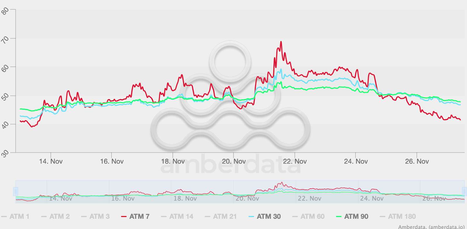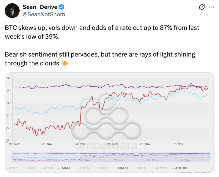 Volatility is cooling as well. The aggressive selloff through October and November drove short-tenor BTC ATM volatility as high as ~60% on November 21. Since then, volatility has compressed almost 25%, now sitting near 45%. This indicates that markets are pricing a lower probability of near-term disorder as liquidity improves and panic flows subside.