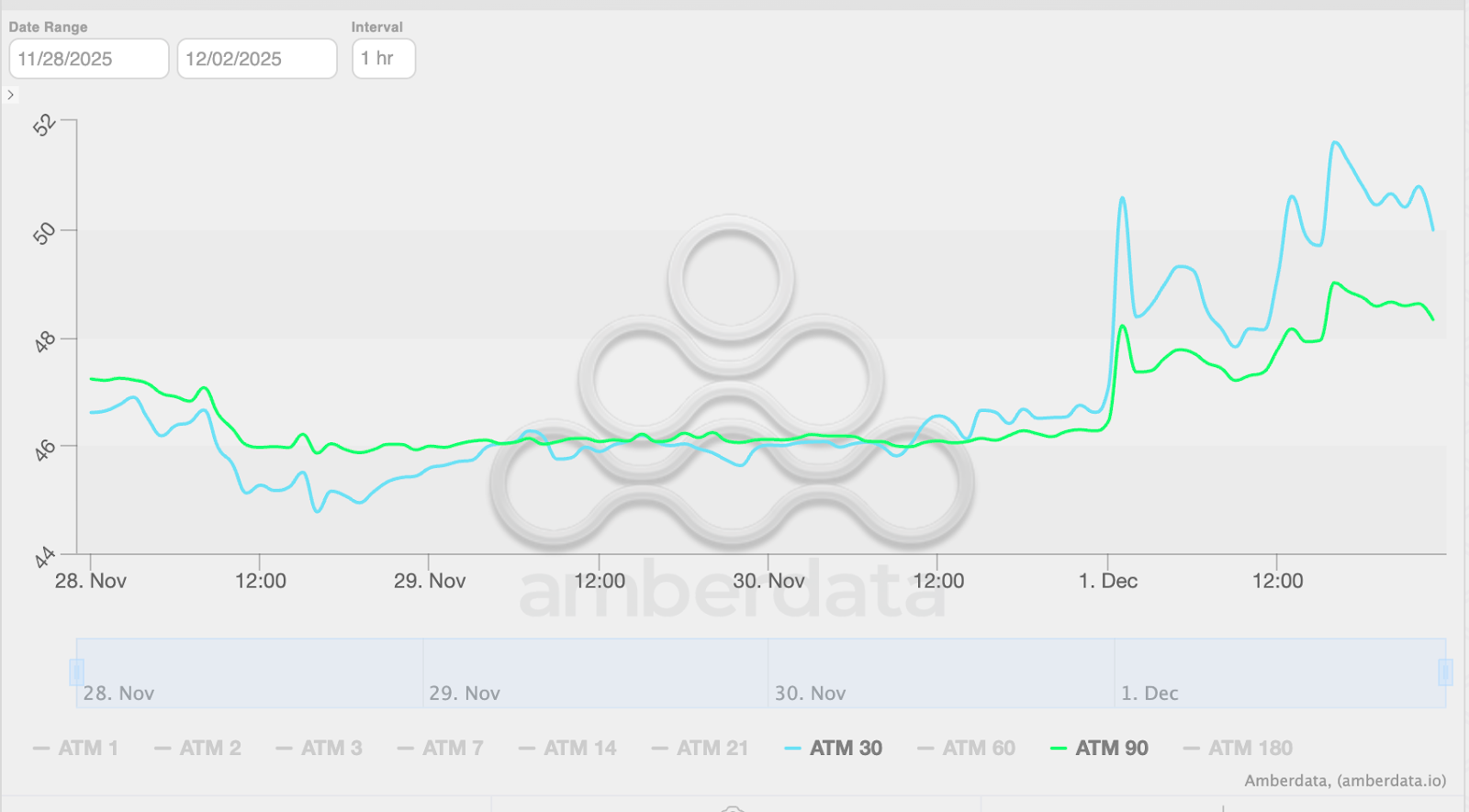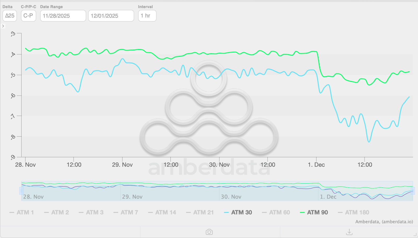 I don’t believe the bottom is in. Short-dated volatility now sits above long-dated BTC volatility, signalling that the market expects outsized swings as we head into the new year.