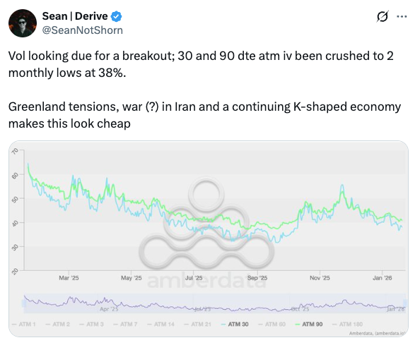 While markets appear calm on the surface, macro risks are building. Rising geopolitical tensions between the U.S. and Europe – particularly around Greenland – raise the risk of a regime shift back into a higher-volatility environment, a dynamic not currently reflected in spot prices.