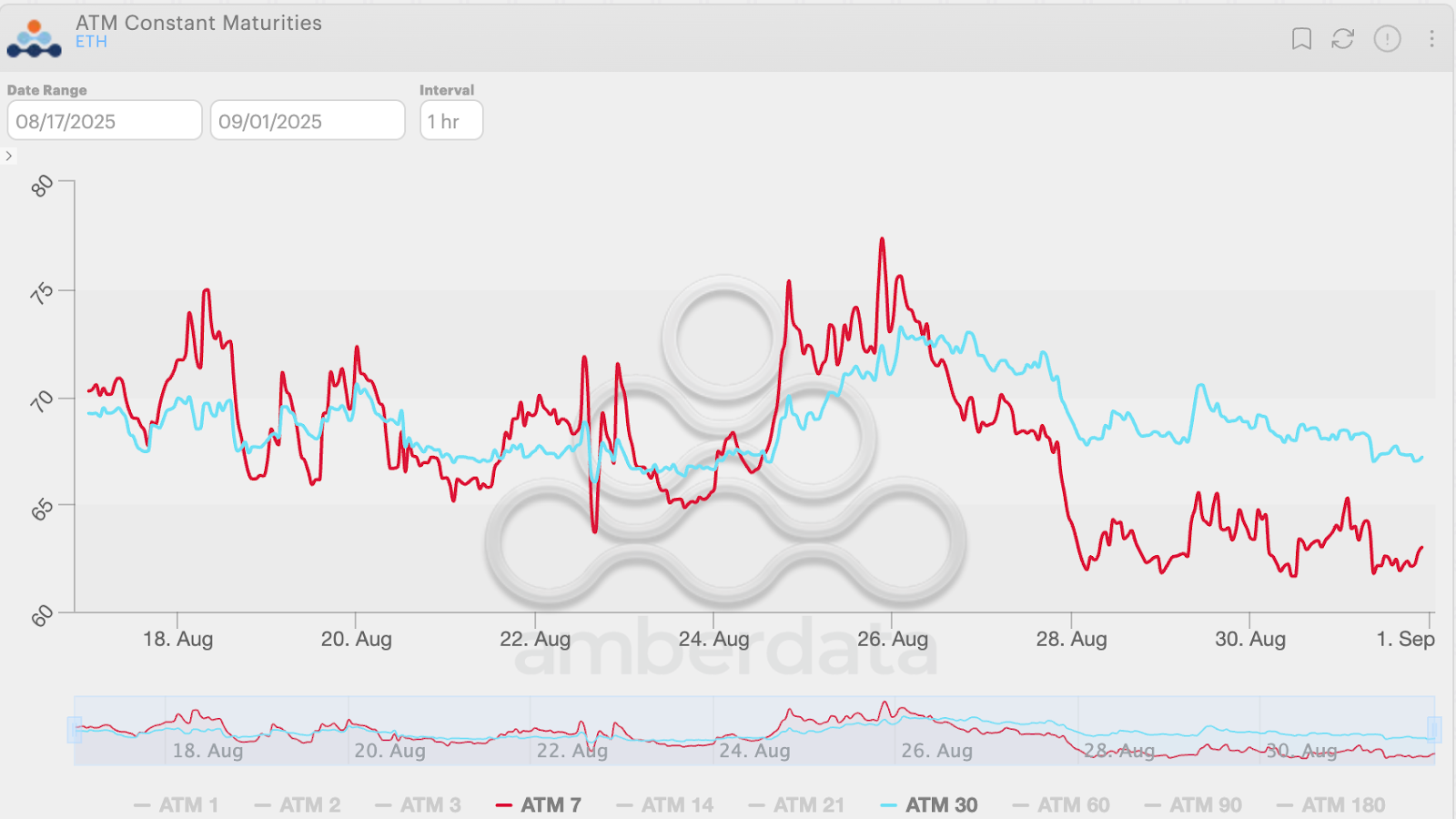 In the options market, short-term ETH volatility has dropped sharply – from 75% to 63% over the past week – suggesting the market is pricing in a steadier, more gradual rally.