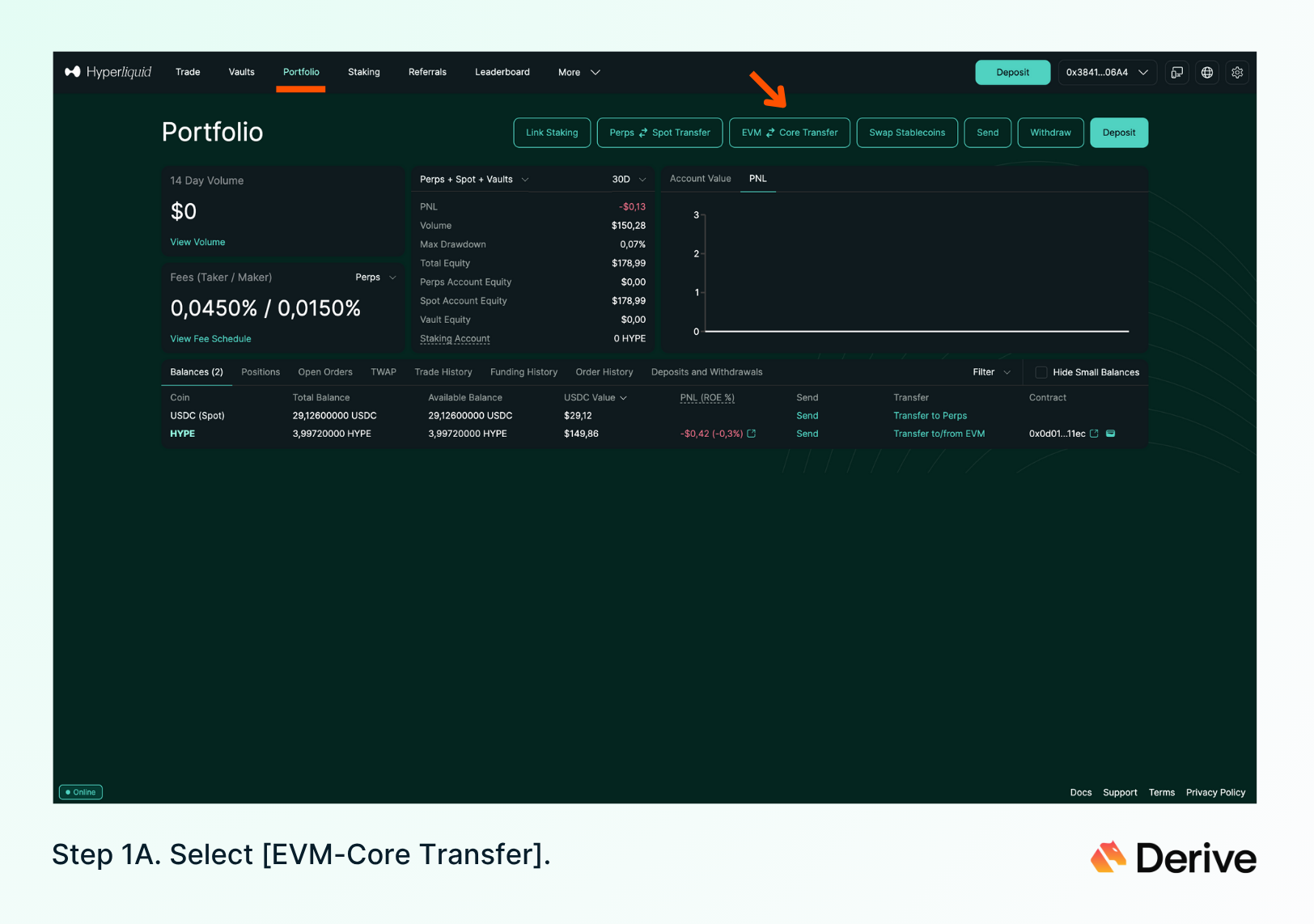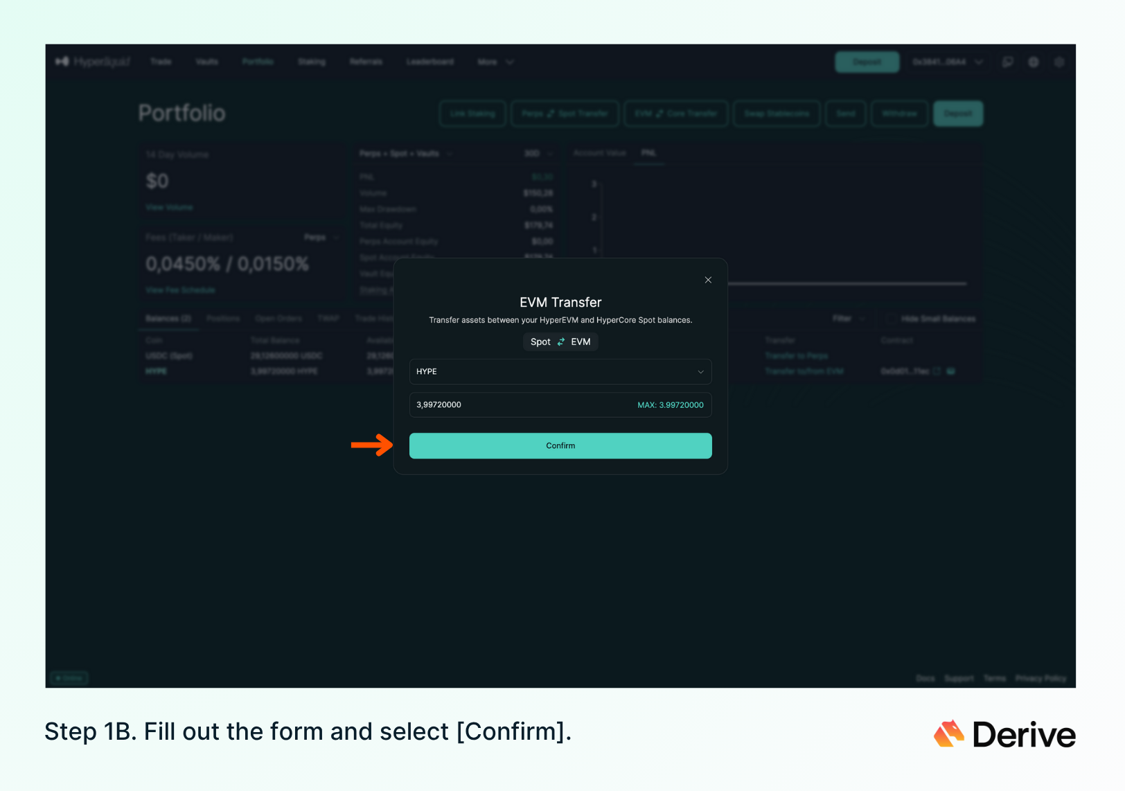 b) Deposit HYPE balance from HyperEVM to Derive.