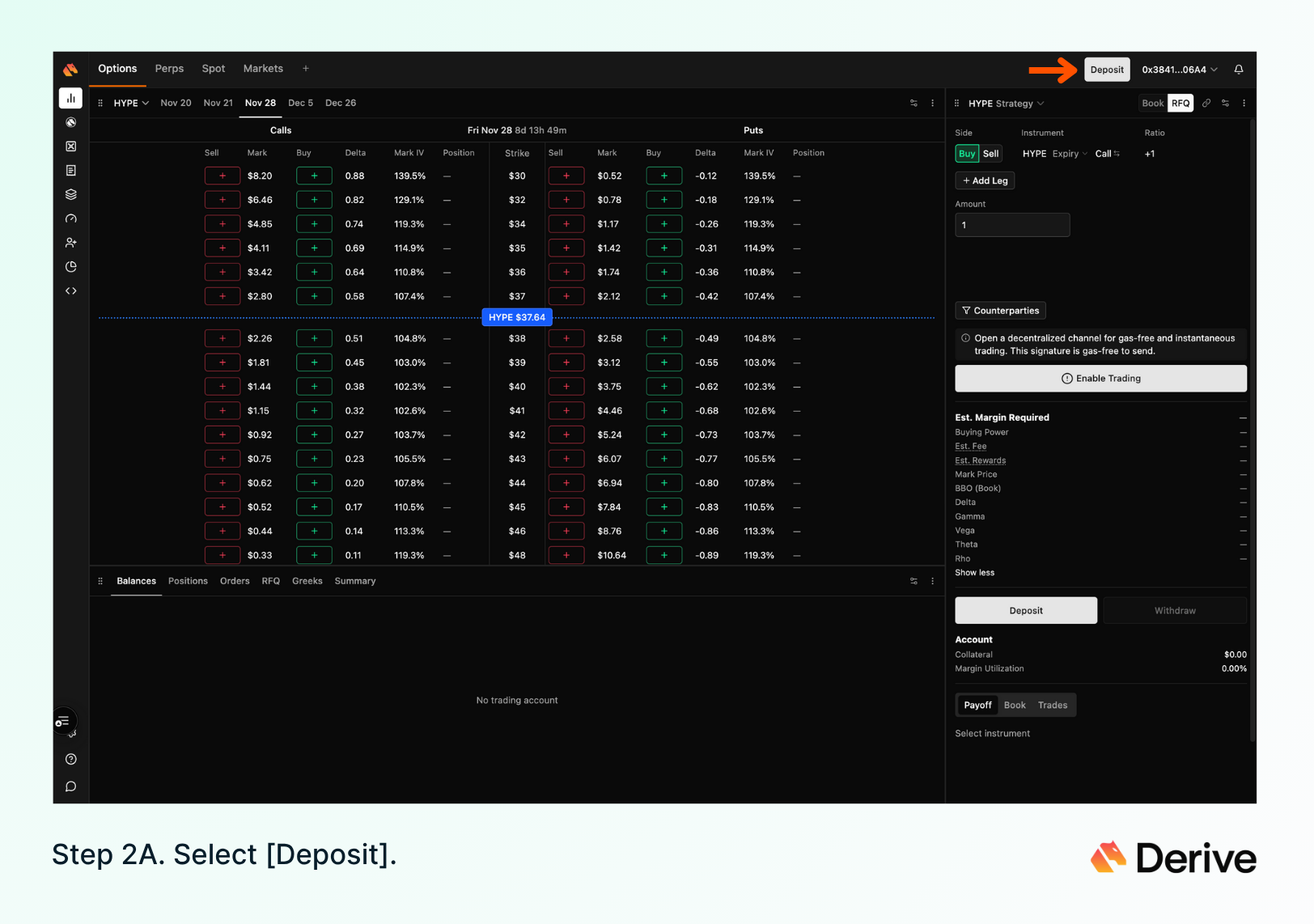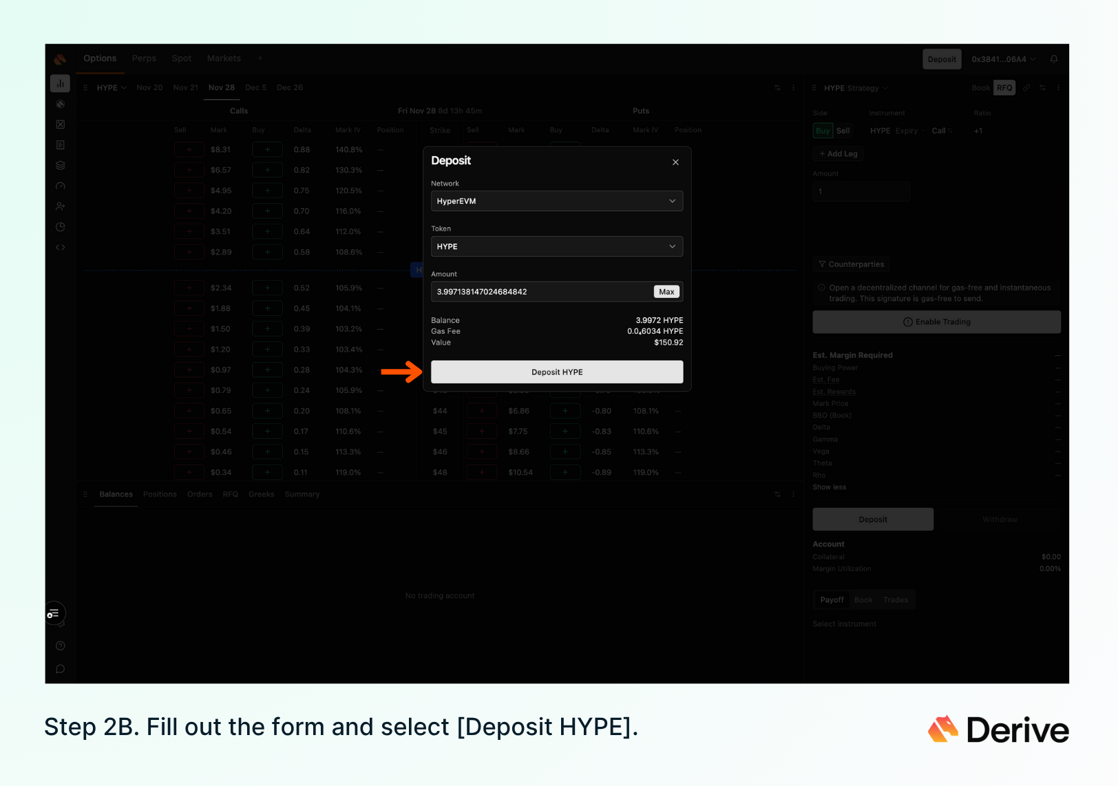 2) Deposit HYPE from HyperEVM into Derive. To complete this step, visit the [Derive web app] and connect the same EVM wallet.