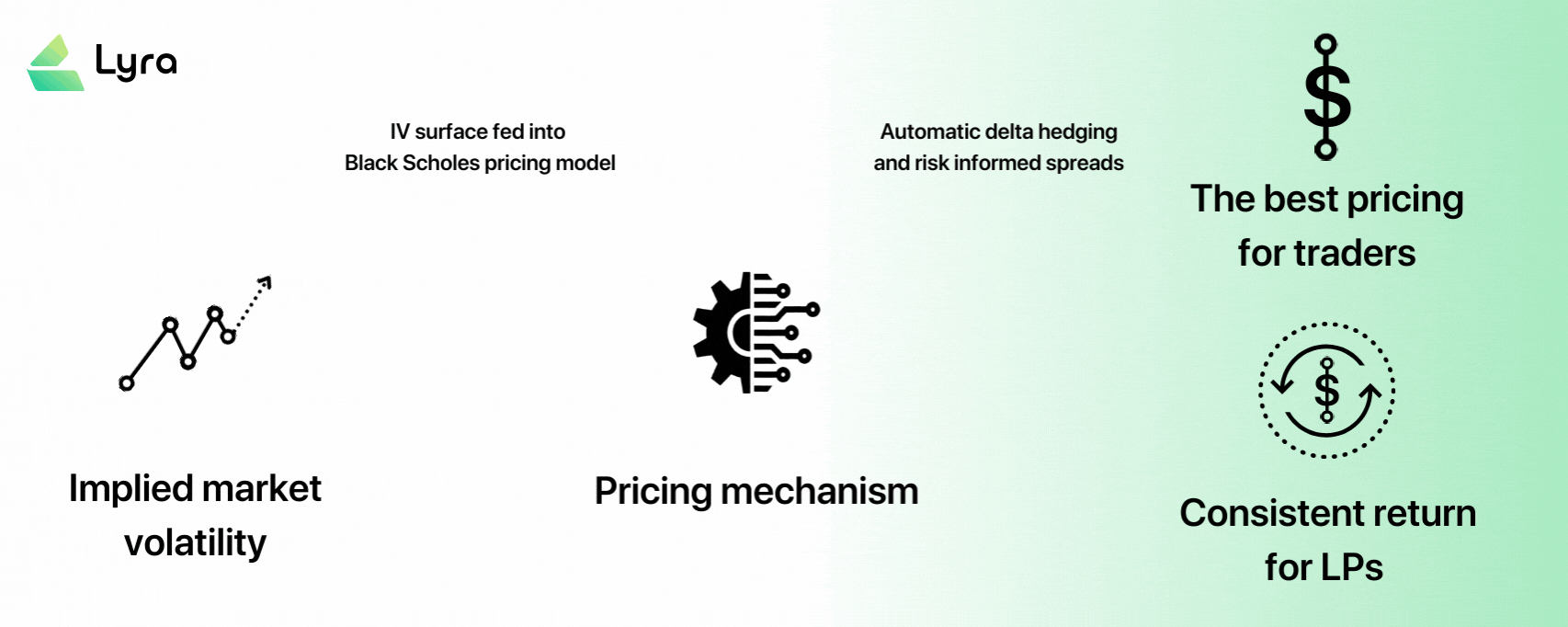 With the advent of L2 and liquid spot markets, it's become possible to build a complete options protocol. Lyra combines the best of traditional options market making (tried and tested pricing and risk management) with crypto’s two biggest strengths right now, scalability and composability. Here’s how we get it done: