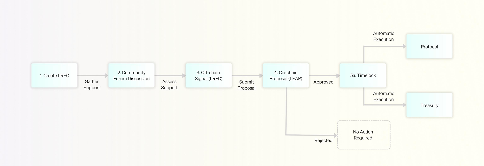 The life cycle of a LEAP can be seen in the image below involving several stages, from creation and community discussion to off-chain signalling (optional), on-chain proposal submission, and finally, execution or rejection.