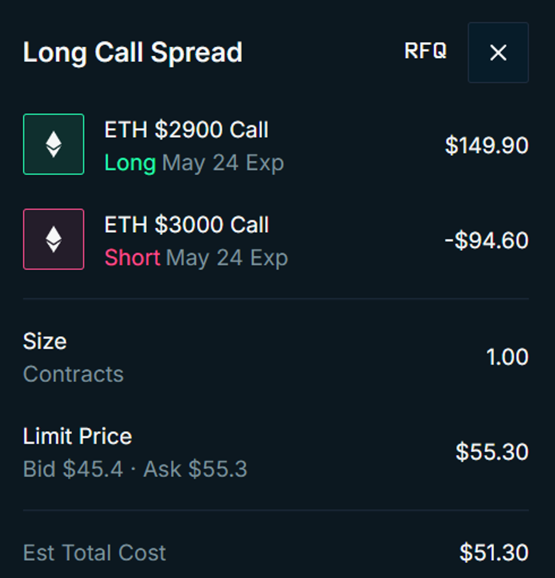 When trading options, executing each leg separately on the orderbook can be costly. Looking at a live example below, typically this spread could cost around $55.30 (at the ask price) for two legs. However, with Derive’s one-click spreads, you only pay $51.30, which is closer to the mid price. This means you save money by paying lower premiums.