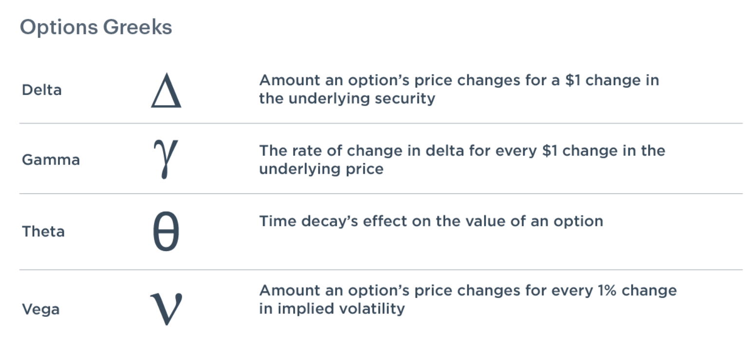 There are many inputs into the price of an option: the price of the asset, its implied volatility, the time to expiration, amongst other things. But how does the price of an option change as these variables change? If volatility goes up 2%, how much does my call go up? If the asset increases by $10, how much does my put go down? The Greeks offer an answer to these questions by measuring the sensitivity of an option’s price to changes in the input parameters. There are many different Greeks, but we will focus on just five of them. As previously mentioned we will cover the five main greeks in detail: Delta, Vega, Theta, Gamma, Rho.