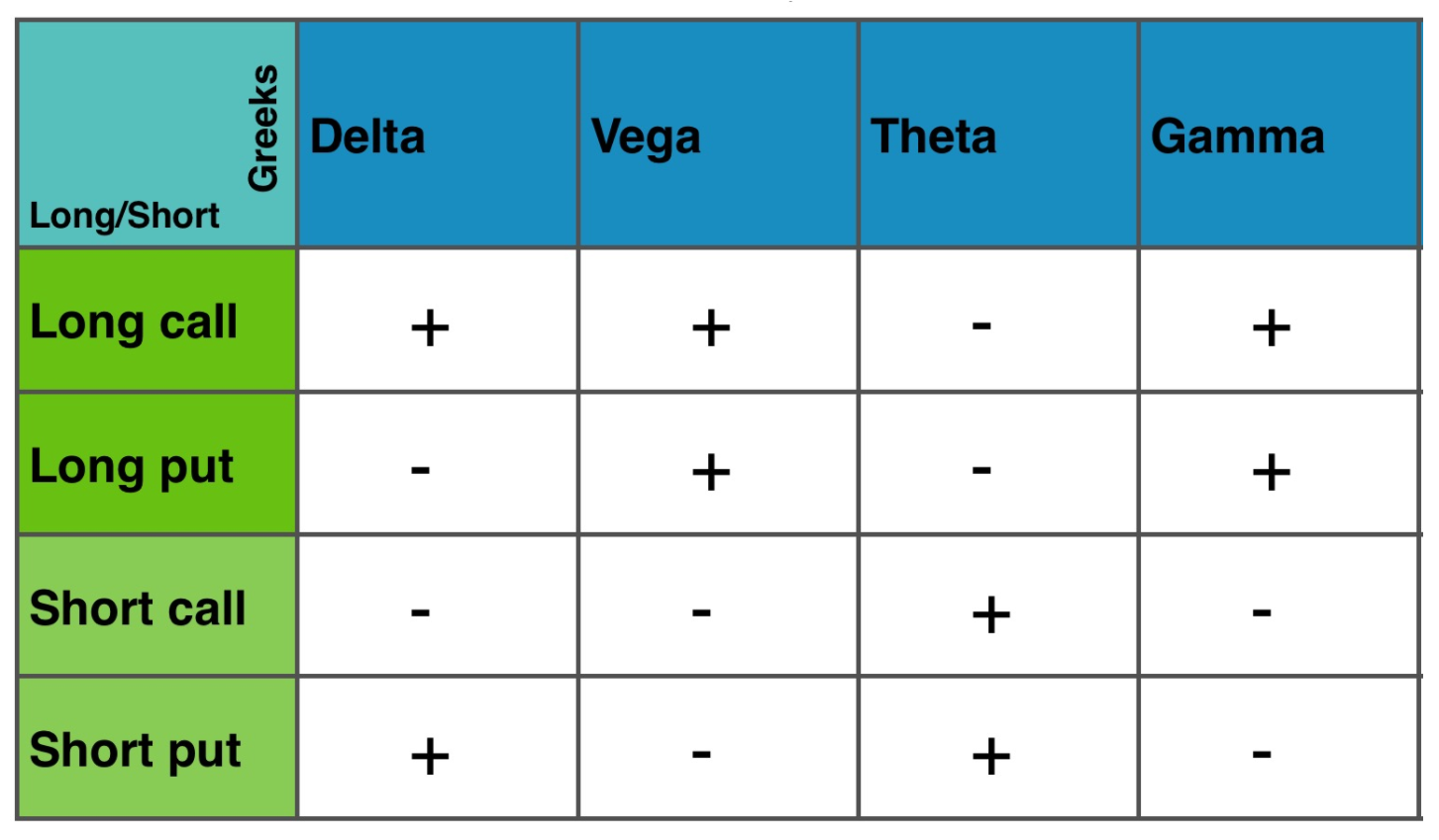 A plus means that an increase in this factor will work in your favor, whereby a minus means that this factor is unfavorable to your position. For example, Delta is positive for long calls meaning that the position will gain value for an increase in the tokens price. In other words, a long call is a bullish strategy or a short put has a positive Theta meaning that time decay works in favor of this position.