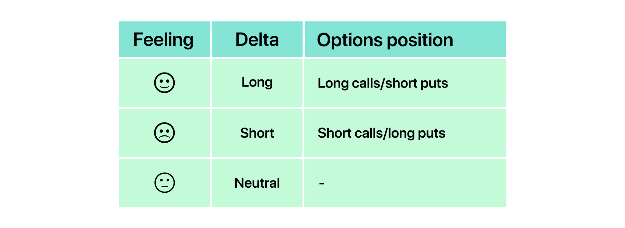 Delta describes the risk associated with changes in the price of the underlying asset. We can get a sense for the delta risk of an options position by examining whether we are happy or sad if the price of the asset we’re trading options on increases:
